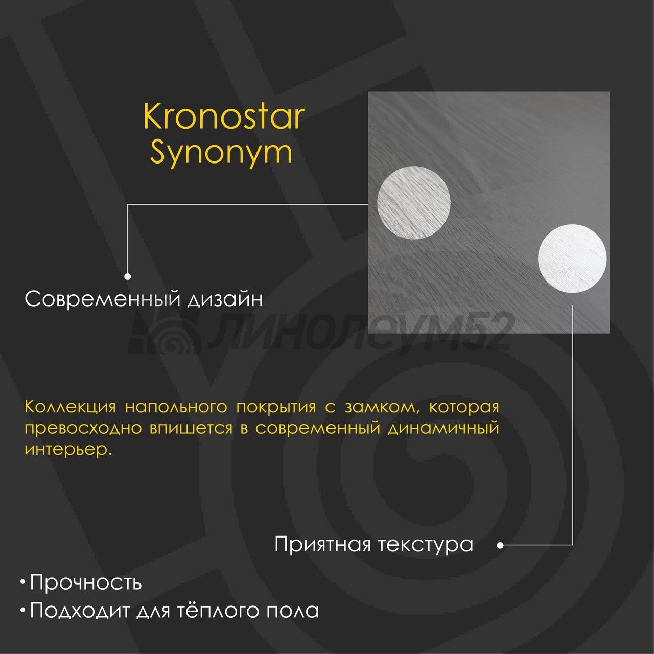 Ламинат Kronostar коллекция Synonym – напольное покрытие 33 класса износостойкости, в котором сочетаются экономичность и высокое качество. Поверхность ламината отлично передает текстуру натурального дерева. Благодаря системе Aquastop замок устойчив к воздействию влаги в течение 25 часов. Ламинат Kronostar Synonym будет служить верой и правдой, не теряя свой облик, Создавая уют и красоту, где каждый миг — твоя жизнь и стиль...