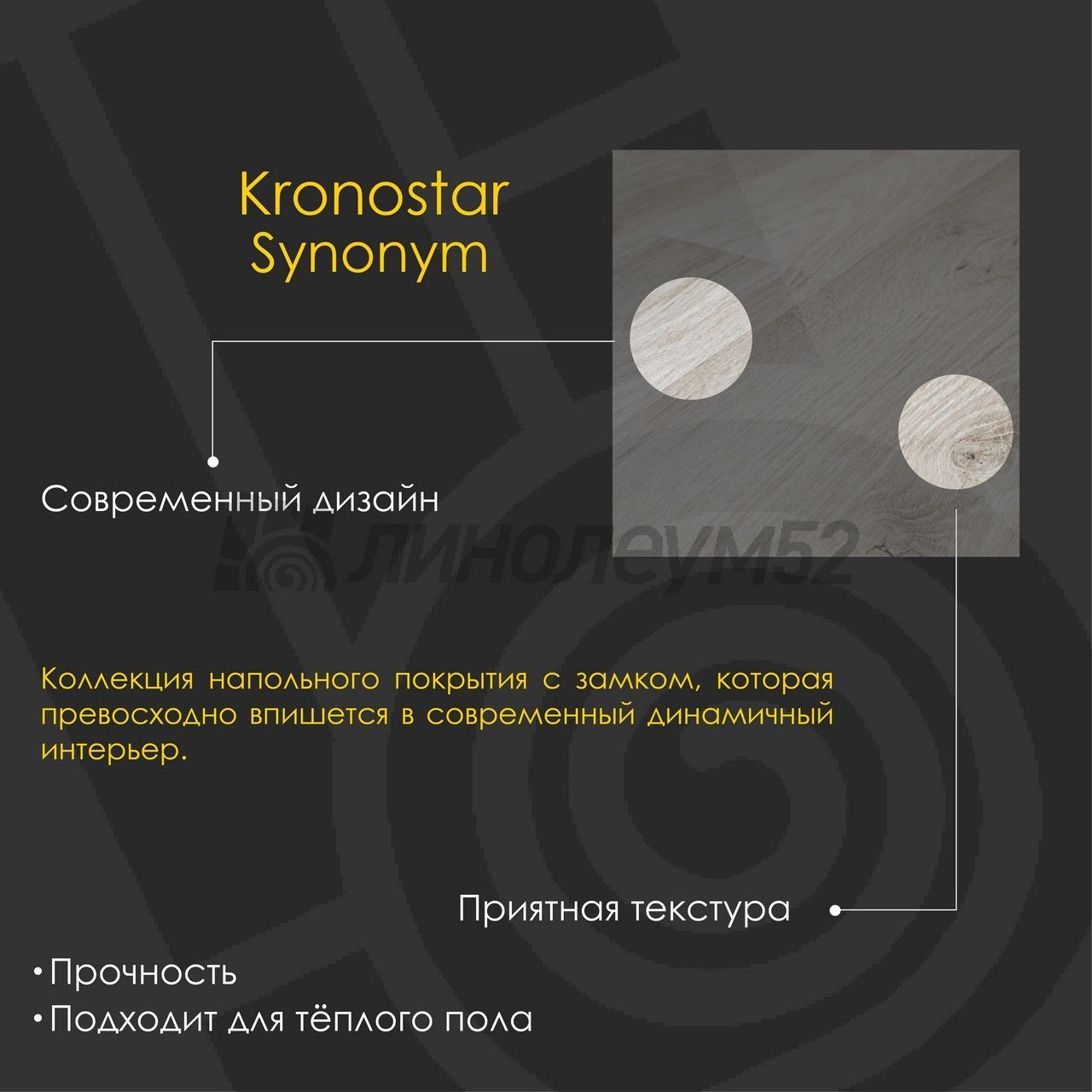 Ламинат Kronostar коллекция Synonym – напольное покрытие 33 класса износостойкости, в котором сочетаются экономичность и высокое качество. Поверхность ламината отлично передает текстуру натурального дерева. Благодаря системе Aquastop замок устойчив к воздействию влаги в течение 25 часов. Ламинат Kronostar Synonym будет служить верой и правдой, не теряя свой облик, Создавая уют и красоту, где каждый миг — твоя жизнь и стиль...
