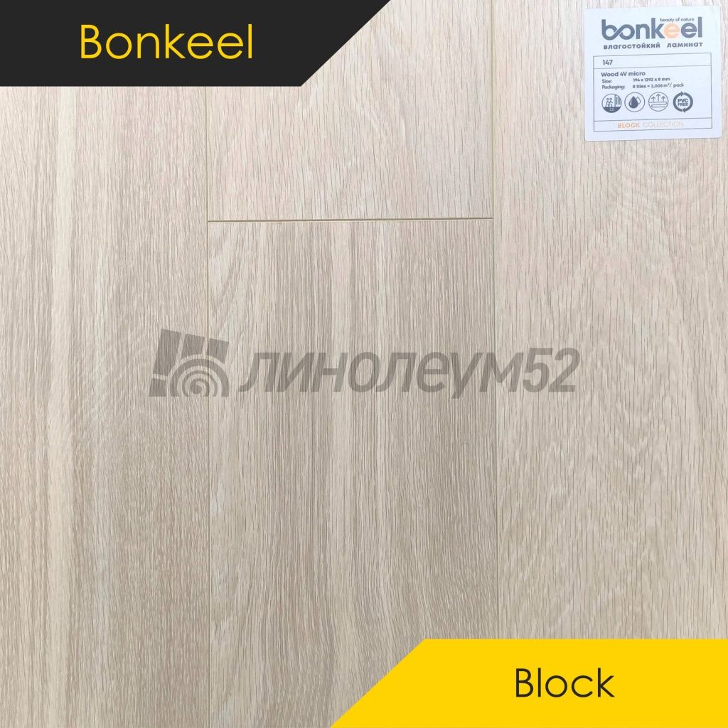 Ламинат - BONKEEL Ламинат 8/32 4V - BLOCK / WOOD 147 от Bonkeel Коллекция:: Block 8/32 4V - Bonkeel, Торговая марка:: Bonkeel, Тип товара:: Ламинат, Применение на покрытие:: Универсальное, Морозостойкость:: Отсутствует, Класс применения:: 32, Толщина: 8.00, Ширина:: 194, Длина:: 1292, Визуальный тип дизайна:: Классическое дерево / Светлый стиль доски, Замковая система:: TC-lock, Четырехсторонняя фаска, Реалистичное тиснение / Тиснение, Тип дизайна:: Классический ламинат, Тип дизайна:: Дерево, Допустимые зоны применения:: Жилые помещения / Кабинеты / Спальные помещения / Гостиная и детская / Кухня и прихожая, Страна производитель:: Россия, Устойчивость к химическим составам:: Низкая, Устойчивость к давлению мебели:: Средняя, Устойчивость к роликовым креслам:: Средняя, Срок службы:: 15 лет, Способ укладки:: Диагональная / Прямая, Фаска:: 4-х сторонняя, Тип укладки:: Замок - CLASSIC, Совместимость с системой тёплый пол: Да (максимум 27°C), Уникальные свойства:: Большой выбор цветов / Высокая износоустойчивость покрытия / Подходит для пола с подогревом +27°С,