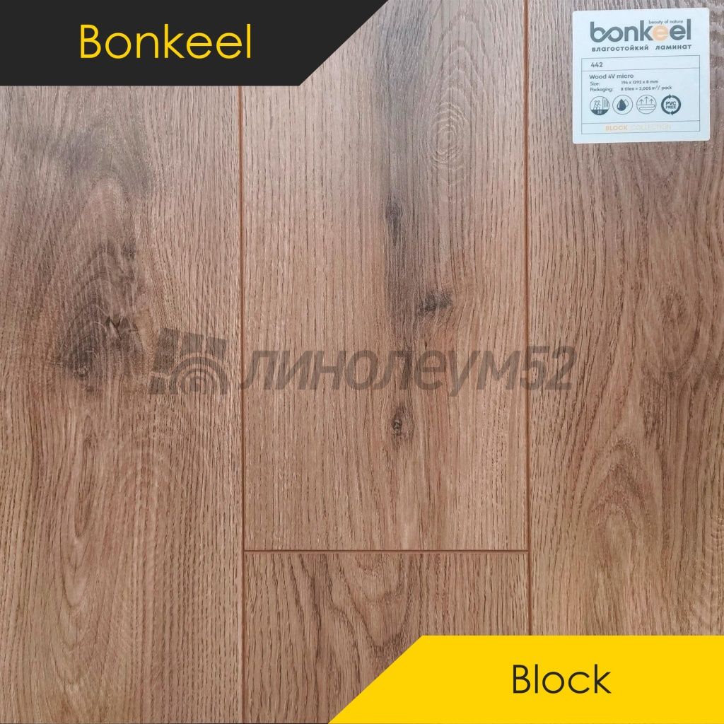 Ламинат - BONKEEL Ламинат 8/32 4V - BLOCK / WOOD 442 от Bonkeel Коллекция:: Block 8/32 4V - Bonkeel, Торговая марка:: Bonkeel, Тип товара:: Ламинат, Применение на покрытие:: Универсальное, Морозостойкость:: Отсутствует, Класс применения:: 32, Толщина: 8.00, Ширина:: 194, Длина:: 1292, Визуальный тип дизайна:: Классическое дерево / Светлый стиль доски, Замковая система:: TC-lock, Четырехсторонняя фаска, Реалистичное тиснение / Тиснение, Тип дизайна:: Классический ламинат, Тип дизайна:: Дерево, Допустимые зоны применения:: Жилые помещения / Кабинеты / Спальные помещения / Гостиная и детская / Кухня и прихожая, Страна производитель:: Россия, Устойчивость к химическим составам:: Низкая, Устойчивость к давлению мебели:: Средняя, Устойчивость к роликовым креслам:: Средняя, Срок службы:: 15 лет, Способ укладки:: Диагональная / Прямая, Фаска:: 4-х сторонняя, Тип укладки:: Замок - CLASSIC, Совместимость с системой тёплый пол: Да (максимум 27°C), Уникальные свойства:: Большой выбор цветов / Высокая износоустойчивость покрытия / Подходит для пола с подогревом +27°С,