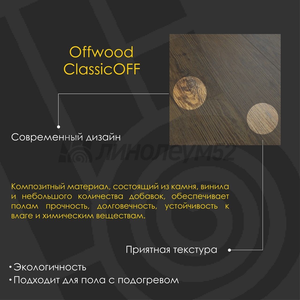 OFFWOOD ClassicOFF — полимерный пол, в основе которого лежит минерально-полимерная плита SPC. Композитный материал, состоящий из камня, винила и небольшого количества добавок, обеспечивает полам прочность, долговечность, устойчивость к влаге и химическим веществам. Толщина ламината составляет 4 мм — он подходит для коммерческих помещений с высокой проходимостью и жилых пространств, где требуется повышенная износостойкость покрытия. Класс пожарной опасности КМ2 подтверждает его безопасность и экологичность. Верхний слой толщиной 0,5 мм обеспечивает защиту от царапин, потертостей и других механических повреждений, значительно продлевая срок службы ламината. Дизайны под дерево придают ламинату OFFWOOD ClassicOFF особую эстетику, позволяя гармонично сочетать его с любым интерьером.