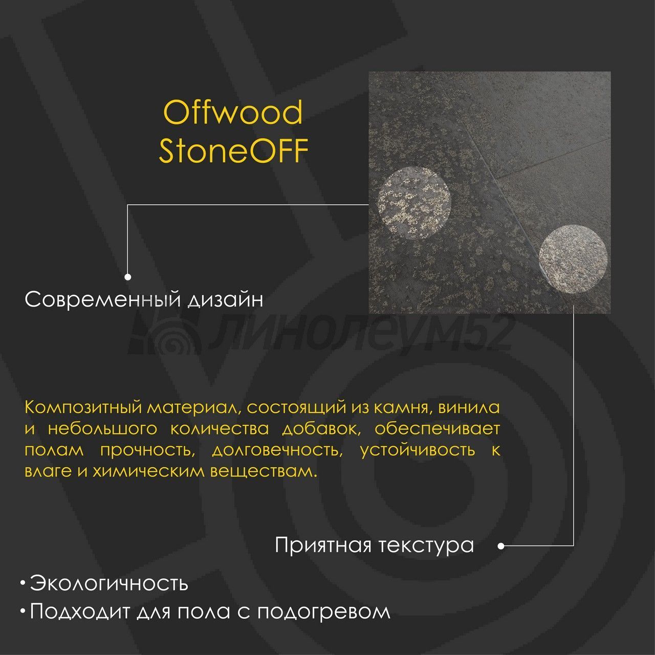 OFFWOOD StoneOFF — коллекция напольных SPC покрытий. Полимерные полы характеризуются прочностью, долговечностью, устойчивостью к воздействию влаги и химических веществ. Напольные покрытия предназначены для укладки как в коммерческих помещениях с высокой проходимостью, так и в жилых пространствах. Полы имеют класс пожарной опасности КМ2, что подтверждает их безопасность и экологичность. Структура полов имитирует натуральный камень. Благодаря цифровой печати, дизайн верхнего слоя выглядит реалистично и эстетично, добавляя интерьеру уникальность. Защитный слой толщиной 0,5 мм снижает вероятность образования царапин, потертостей и других механических повреждений, значительно продлевая срок службы пола. Покрытия доступны в светлых и темных тонах, что позволяет легко подобрать их под дизайн помещения.