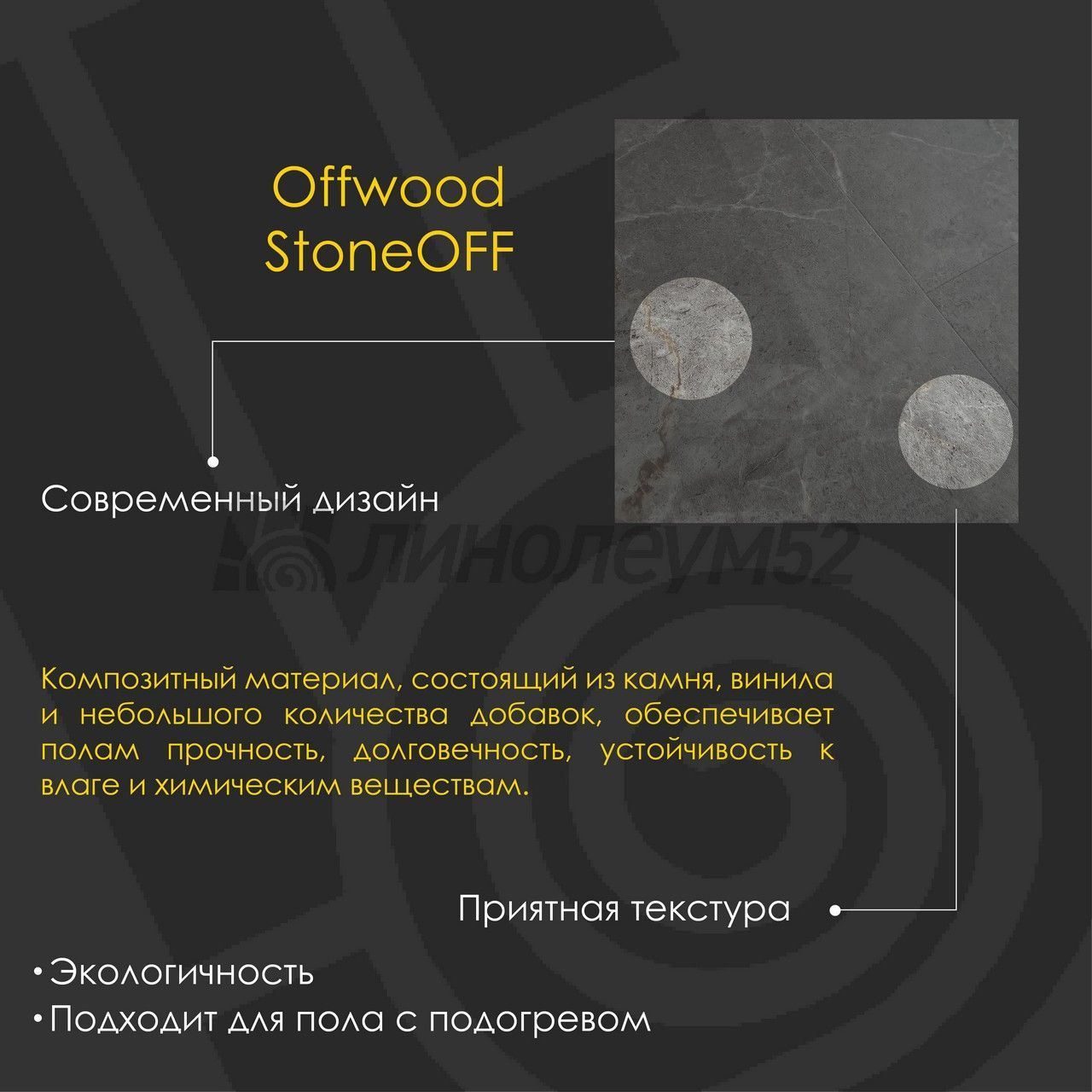 OFFWOOD StoneOFF — коллекция напольных SPC покрытий. Полимерные полы характеризуются прочностью, долговечностью, устойчивостью к воздействию влаги и химических веществ. Напольные покрытия предназначены для укладки как в коммерческих помещениях с высокой проходимостью, так и в жилых пространствах. Полы имеют класс пожарной опасности КМ2, что подтверждает их безопасность и экологичность. Структура полов имитирует натуральный камень. Благодаря цифровой печати, дизайн верхнего слоя выглядит реалистично и эстетично, добавляя интерьеру уникальность. Защитный слой толщиной 0,5 мм снижает вероятность образования царапин, потертостей и других механических повреждений, значительно продлевая срок службы пола. Покрытия доступны в светлых и темных тонах, что позволяет легко подобрать их под дизайн помещения.