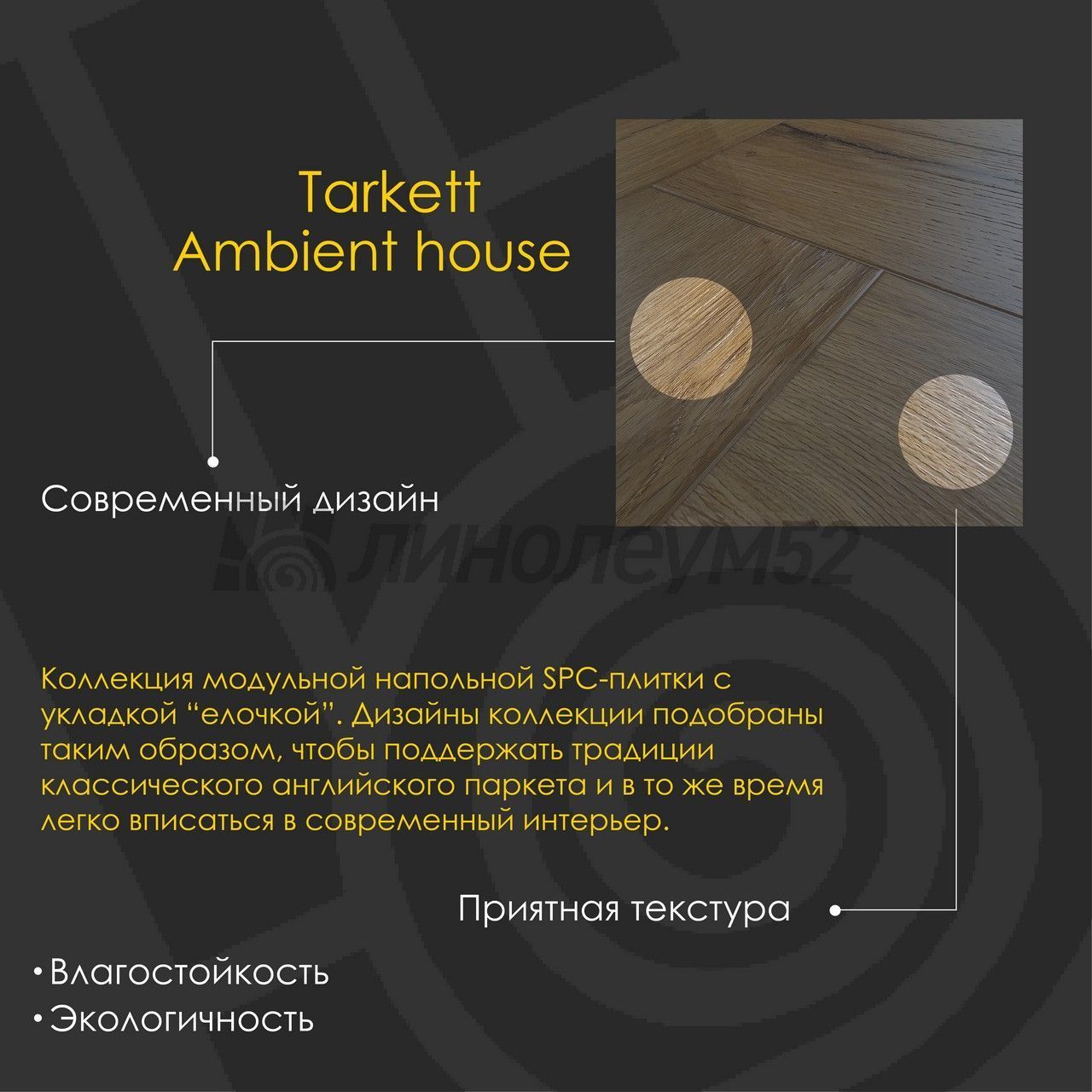 Новейшая коллекция от компании "TARKETT" сочетает те необходимые свойства, когда речь идет о простом и качественном решении при выборе напольного покрытия. Уникальная коллекция "AMBIENT HOUSE" выступает с размерами 675*135*4,1 и задаёт новые стандарты напольным покрытиям. Прочная и износостойкая, поэтому без труда выдержит эксплуатацию в жилых помещениях с высокой нагрузкой на пол - коридорах, прихожих и кухнях. Безопасная, поэтому подойдет для укладки даже в детских комнатах. Данный стиль воплощает красоту камня, современные оттенки и богатые структуры дерева, которые станут привлекательной частью интерьера. Замковая система поможет уложить покрытие легко и быстро. Для того, чтобы чувствовать себя счастливым, бывает достаточно самых простых вещей. Для того, чтобы создать комфортную атмосферу в доме, бывает достаточно самых простых решений. "AMBIENT HOUSE" - это простое наслаждение красотой напольного покрытия без лишних усилий. Если же у вас ещё остались вопросы, то наши специалисты с лёгкостью помогут найти ответы на каждый из них...