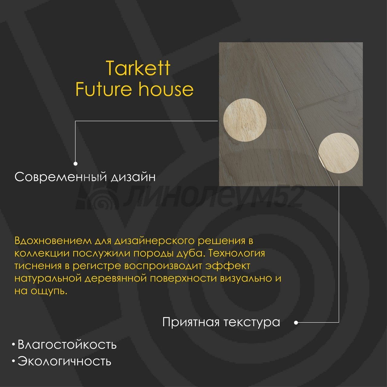 Модульная SPC плитка Art Vinyl Tarkett FUTURE HOUSE производится из прочного каменно-полимерного композита и дополнена усиленным износостойким слоем. Усовершенствованная замковая система Tarkett Click надежно соединяет планки и исключает попадание влаги под покрытие. Вдохновением для дизайнерского решения в коллекции FUTURE HOUSE послужили породы дуба. Технология тиснения в регистре воспроизводит эффект натуральной деревянной поверхности визуально и на ощупь. Крашеная фаска с четырех сторон подчеркивает характер каждого декора. Высокотехнологичное производство, использование качественных и безопасных компонентов позволило получить на продукцию экологический сертификат «Листок Жизни».Если же у вас ещё остались вопросы или возникли сомнения по поводу покрытия, наши специалисты с радостью помогут найти ответы на каждый из них...